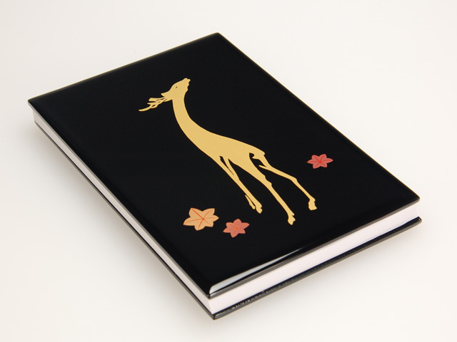 寸法<br>縦:約16cm×横:約11cm×厚み:約1.8cm木地: シナ合板塗質: ツヤのある漆塗塗色: 黒蒔絵師:佐藤直樹日本製装丁法::折本装本 20折(片面20頁 両面使用可能) 外装:化粧箱に入れ、包装した状態でのお届けとなります。